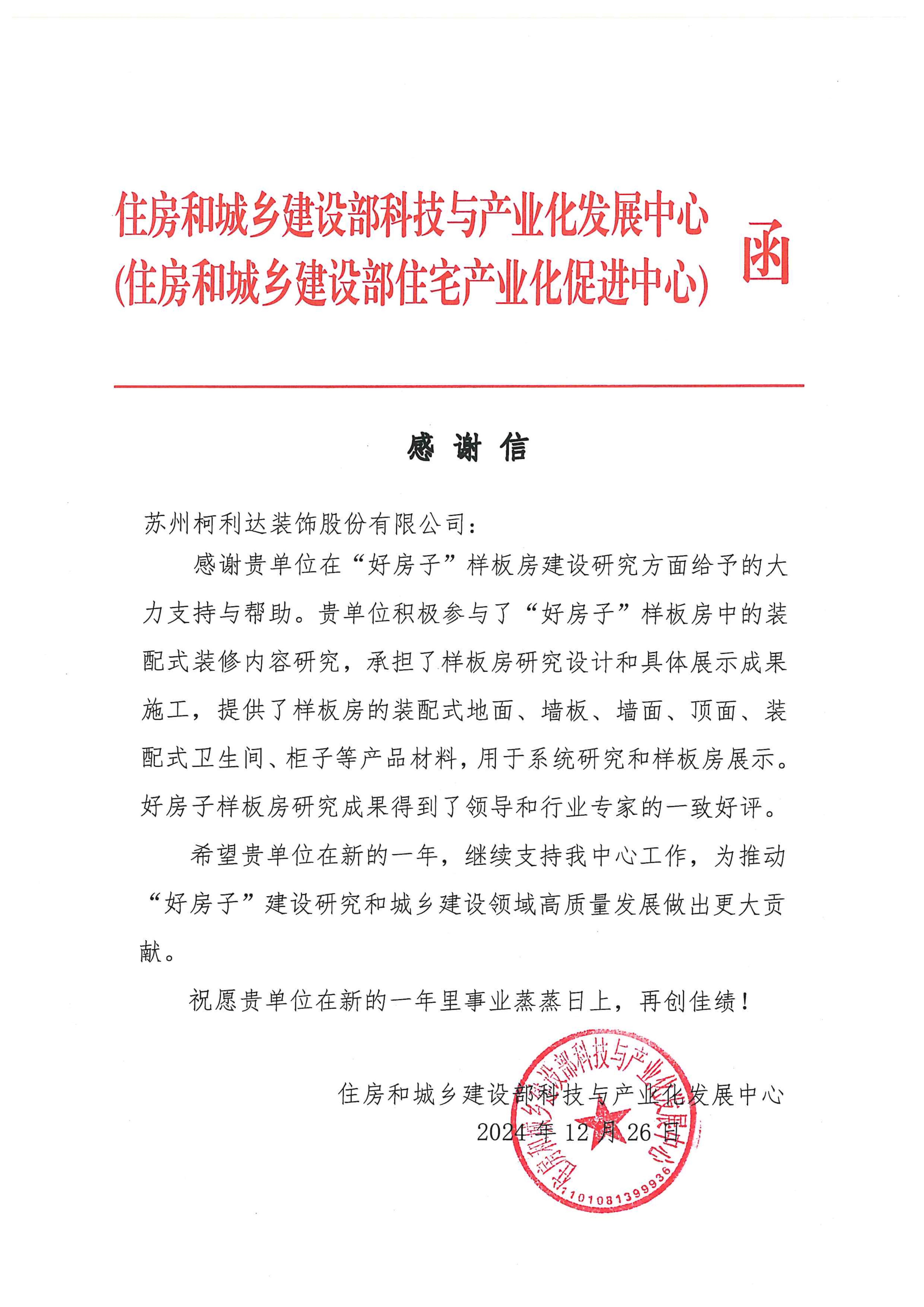 新歲漸近,祥光煥彩。在辭舊迎新之際,柯利達收到來自住房和城鄉(xiāng)建設部科技與產(chǎn)業(yè)化發(fā)展中心發(fā)來的感謝信,對公司在“好房子”樣板房建設研究方面給予的大力支持與